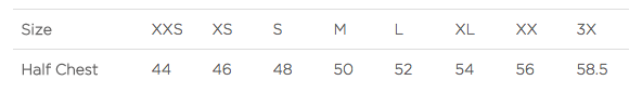 Half Chest (cm) 44 46 48 50 52 54 56 58.5